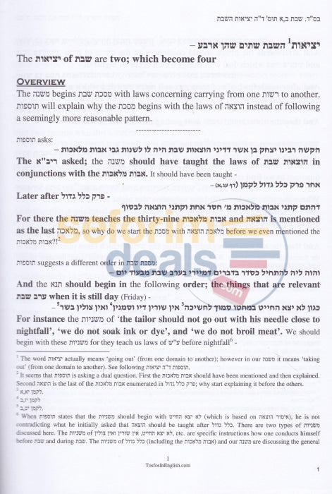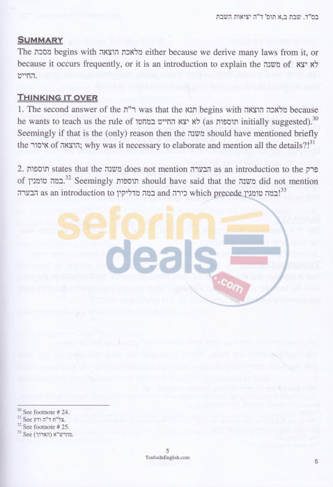 Tosfos in English on the First Perek of Gemara Shabbos. Includes a Summary and Thinking it Over section for each Tosfos.