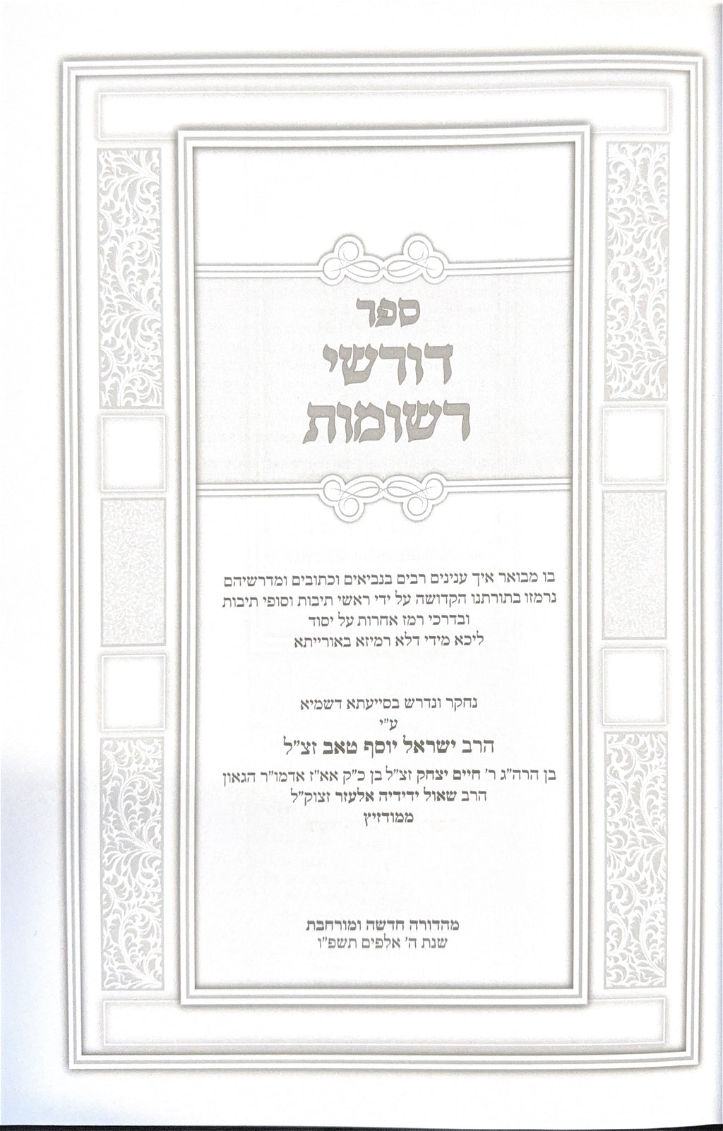 Product Informationדורשי רשומותDorshei ReshumosHardcover | 7" x 10" | 600 Pagesמאת הרב ישראל יוסף טאבAbout this Bookרמזי שמות התורה ע״י ראשי תיבות וסופי תיבות