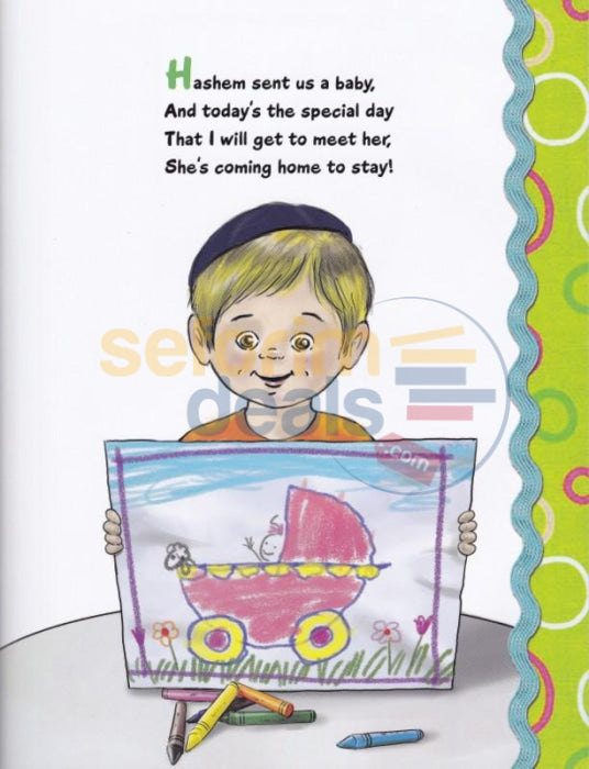 The big brother in this story is only three, but he quickly learns to wash his hands before holding his new sibling, practices using a soft and gentle touch, and marvels at how small she is! He really enjoys the extra mitzvos all big brothers and sisters can do, like bringing diapers or the pacifier. The baby’s loud cries are startling, but he soon learns they have an important purpose.