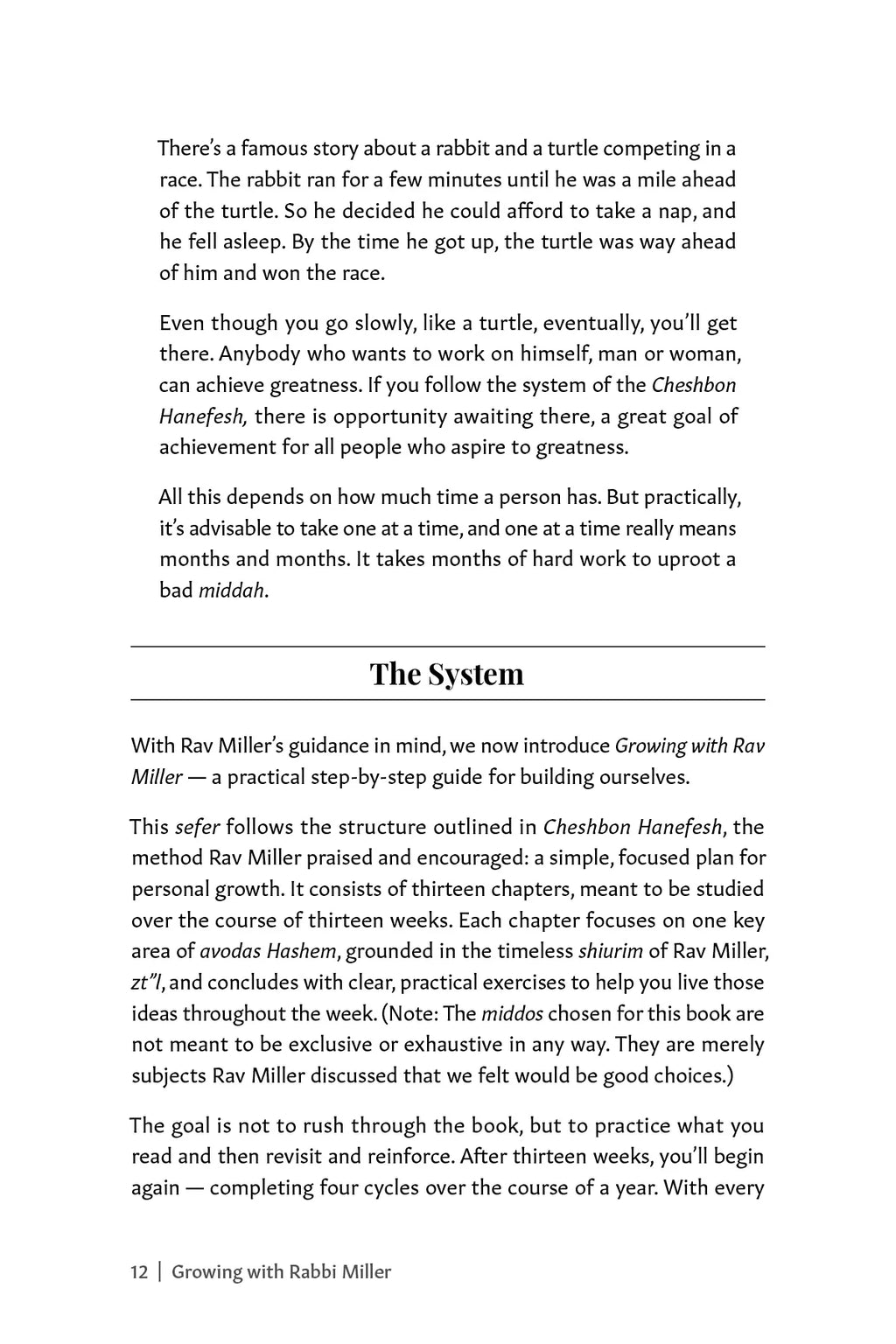 Growing with Rav Miller takes his real-life advice and turns it into an easy-to-follow system for personal growth. Inspired by the classic sefer Cheshbon Hanefesh (which Rav Miller strongly recommended), this book walks you through thirteen key areas of serving Hashem — one middah per week — with clear tips, relatable challenges, and practical guidance from Rav Miller himself.